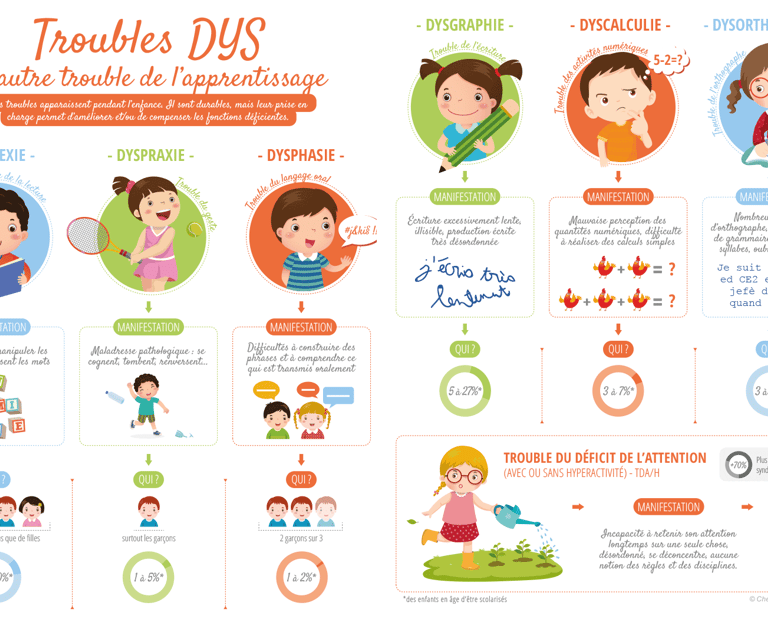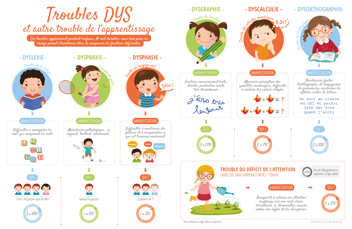 Certains troubles se manifestent plus spécifiquement lors des apprentissages scolaires, qui resteront plus lents, laborieux, coûteux sur le plan de la charge mentale (l’enfant ne peut pas automatiser certaines compétences, cela peut générer une fatigue importante). Les plus habituels touchent la lecture et l’orthographe (dyslexie et dysorthographie), l'écriture (dysgraphie) et les « mathématiques » (dyscalculie). Ils sont régulièrement associés au trouble du langage oral (dysphasie), au TDC, au TDA/H ou au TDA (dans près de 40% des cas, un enfant concerné par un trouble spécifique des apprentissages présente plusieurs troubles, source Inserm).