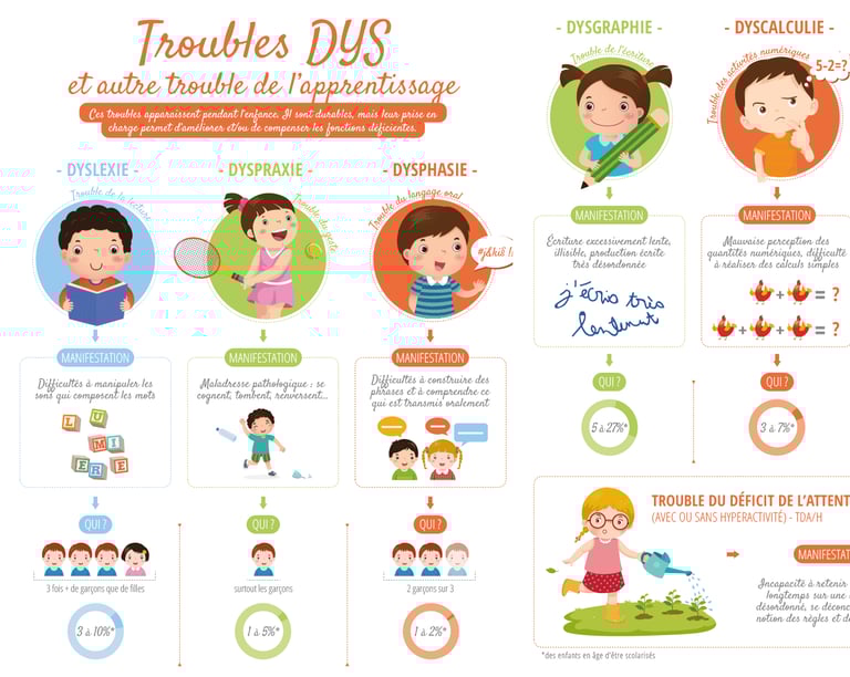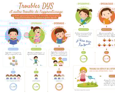 Certains troubles se manifestent plus spécifiquement lors des apprentissages scolaires, qui resteront plus lents, laborieux, coûteux sur le plan de la charge mentale (l’enfant ne peut pas automatiser certaines compétences, cela peut générer une fatigue importante). Les plus habituels touchent la lecture et l’orthographe (dyslexie et dysorthographie), l'écriture (dysgraphie) et les « mathématiques » (dyscalculie). Ils sont régulièrement associés au trouble du langage oral (dysphasie), au TDC, au TDA/H ou au TDA (dans près de 40% des cas, un enfant concerné par un trouble spécifique des apprentissages présente plusieurs troubles, source Inserm).